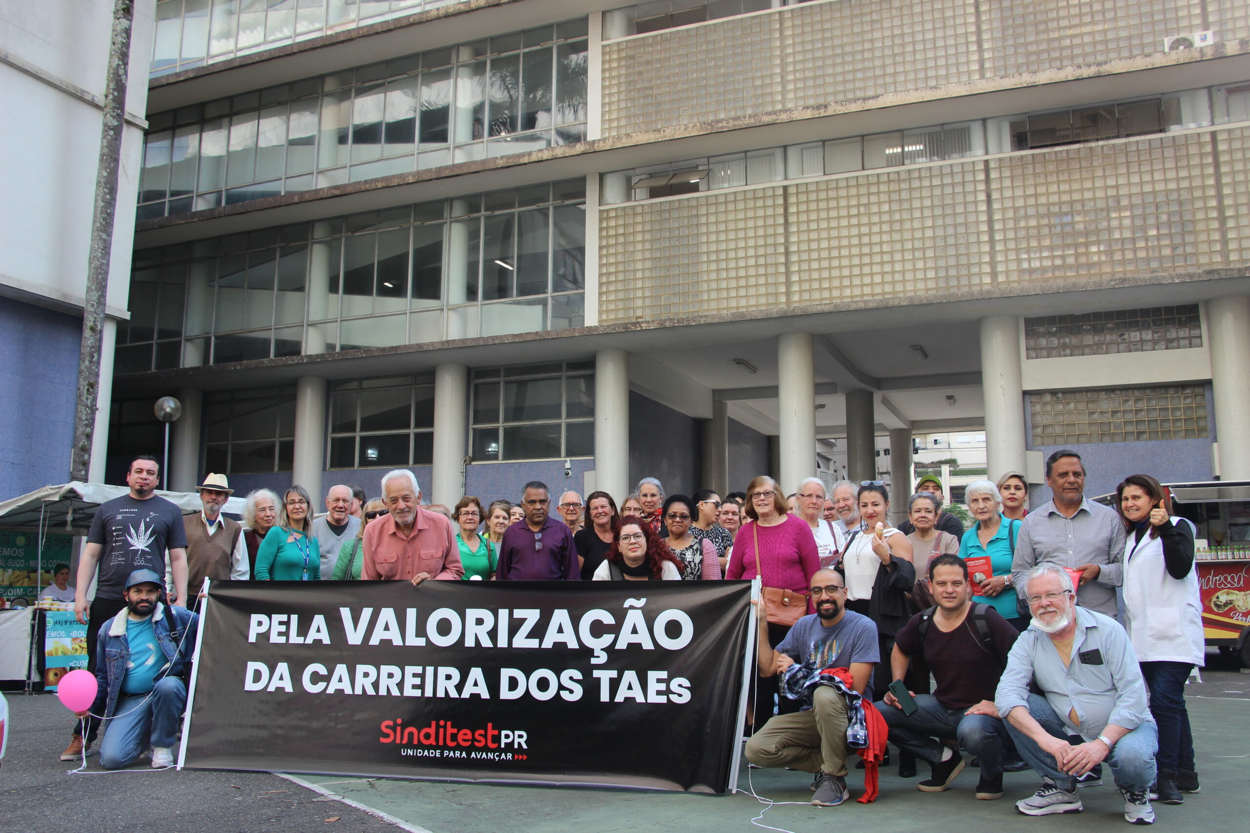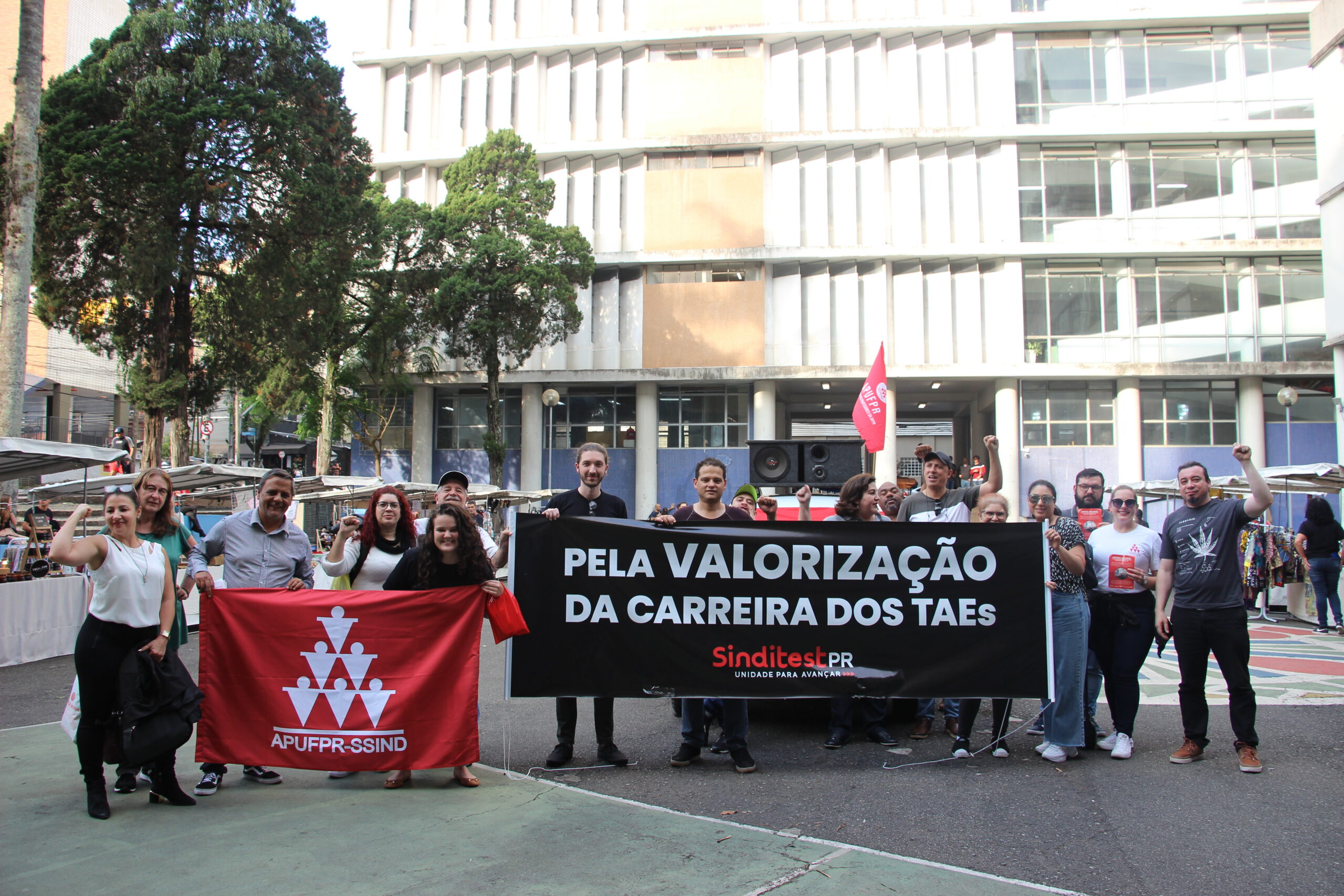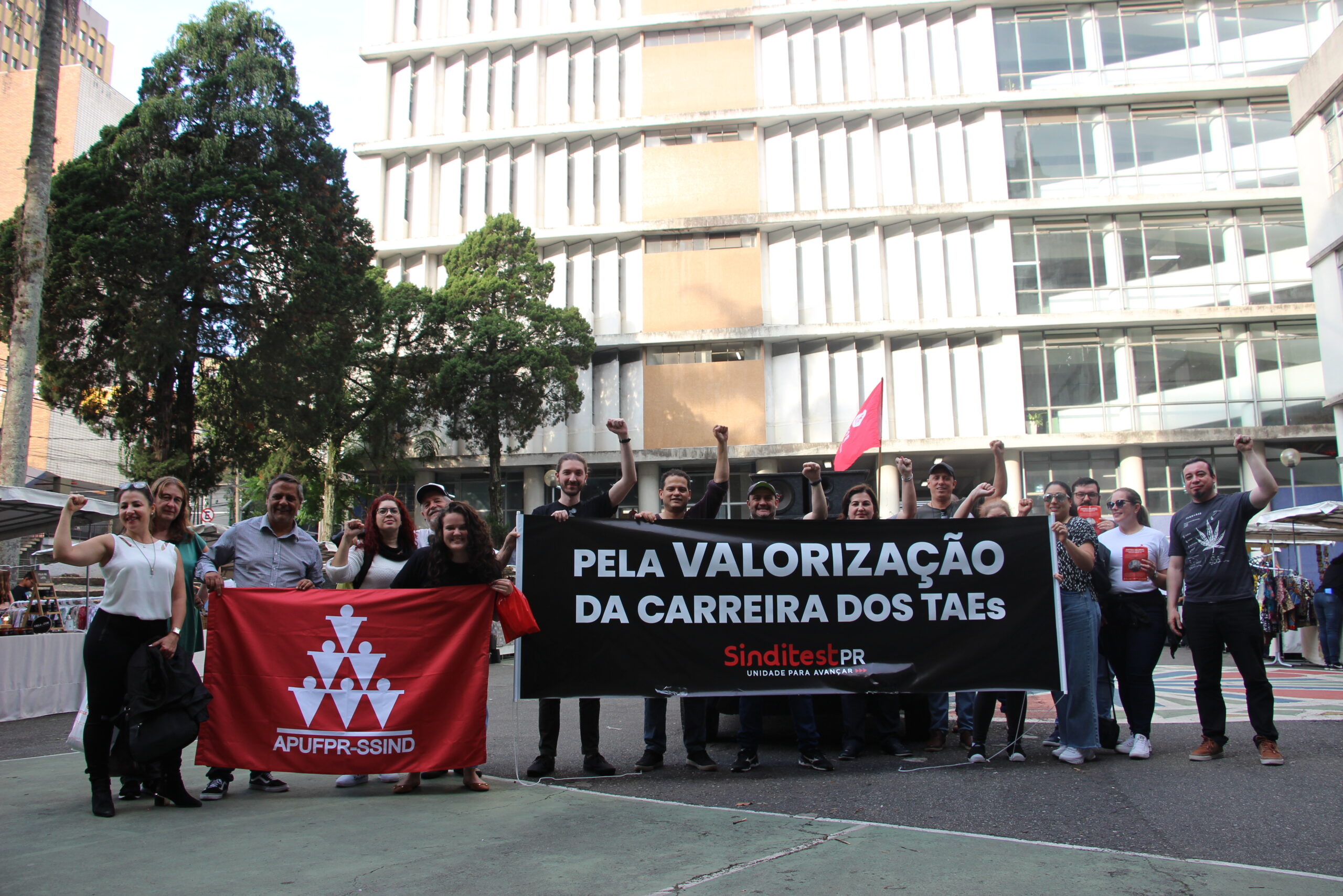 Após a Assembleia, as técnicas e técnicos presentes se concentraram no Pátio da Reitoria da UFPR para o ato pela valorização da carreira dos TAEs pelo Dia Nacional de Luta e Mobilização do Serviço Público Federal. A ação foi promovida pelo Sinditest-PR, junto a APUFPR, e teve como pauta a defesa da recomposição salarial, reestruturação das carreiras, abertura de mesas setoriais, entre outras.