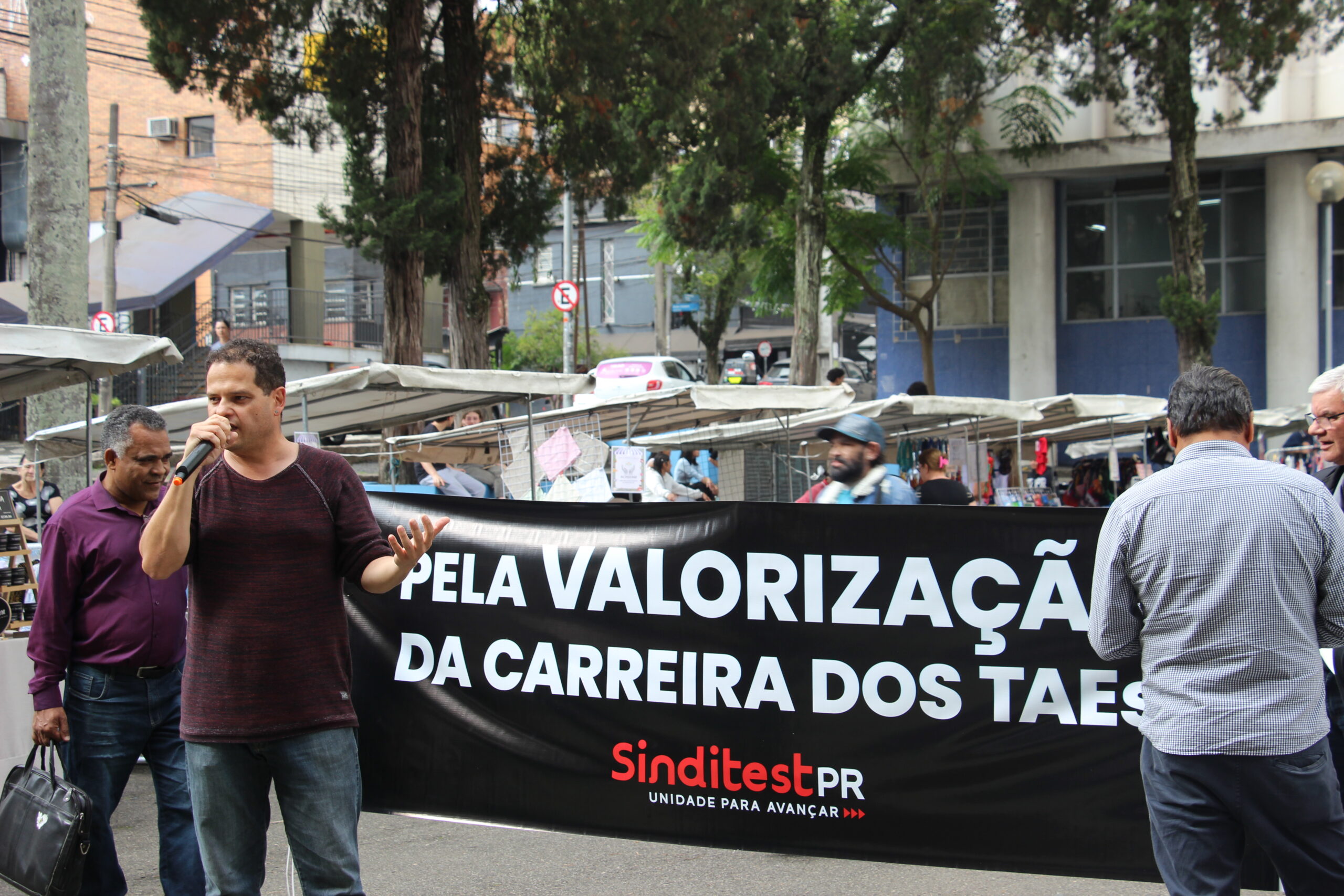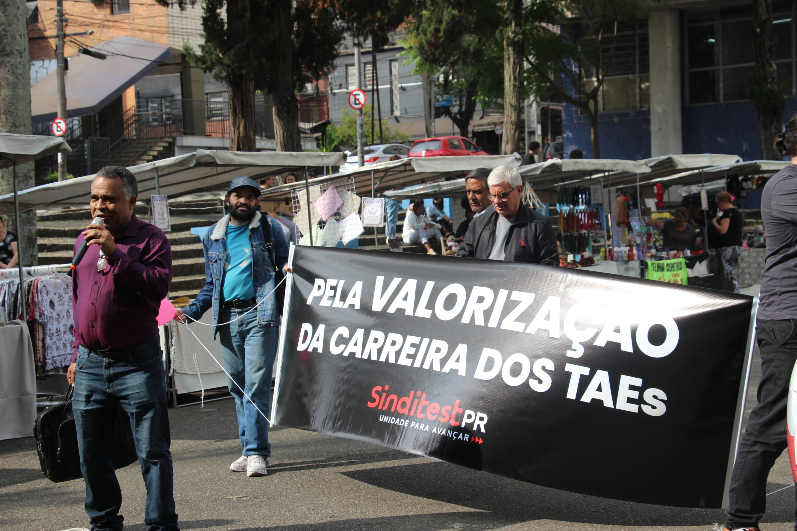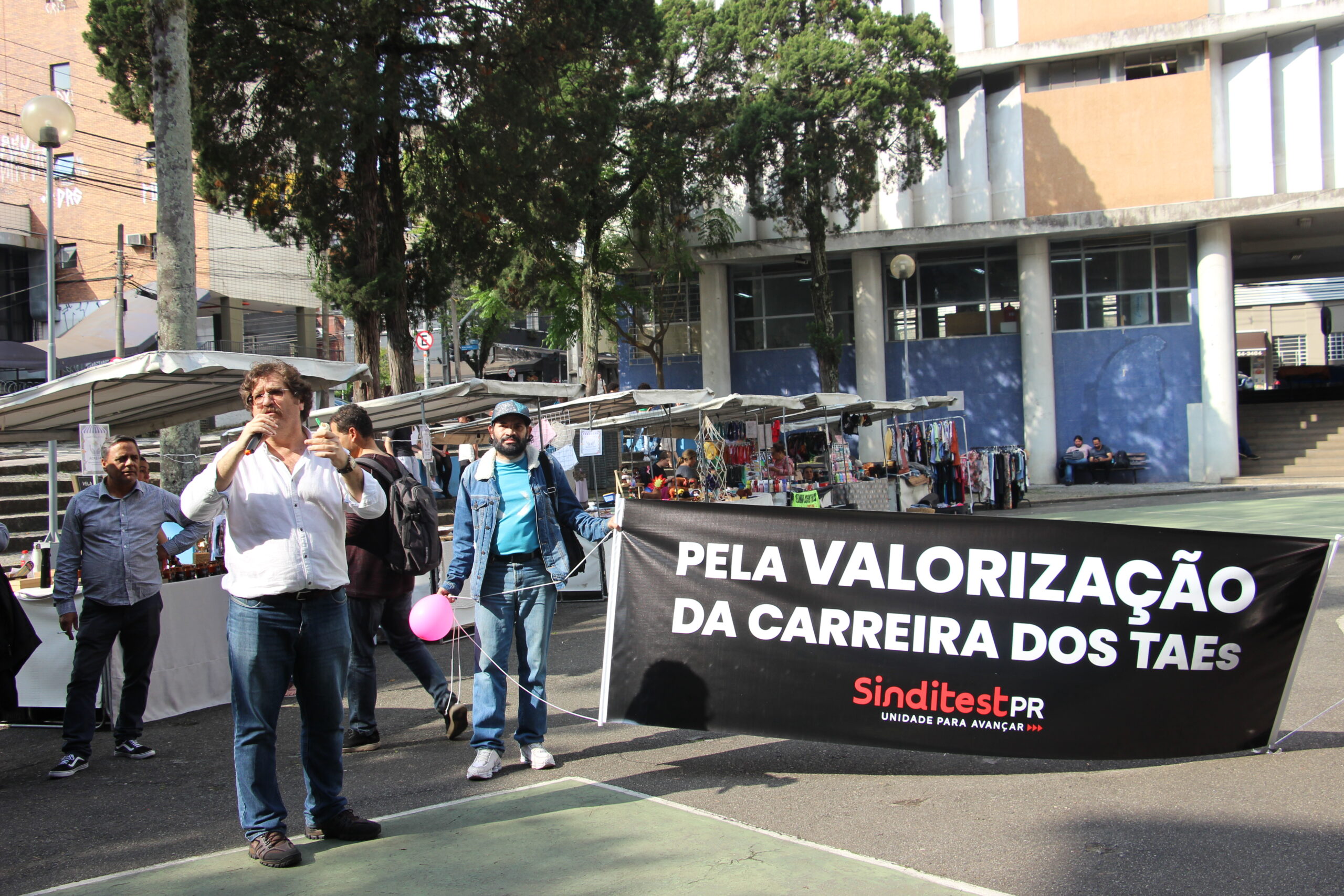 Após a Assembleia, as técnicas e técnicos presentes se concentraram no Pátio da Reitoria da UFPR para o ato pela valorização da carreira dos TAEs pelo Dia Nacional de Luta e Mobilização do Serviço Público Federal. A ação foi promovida pelo Sinditest-PR, junto a APUFPR, e teve como pauta a defesa da recomposição salarial, reestruturação das carreiras, abertura de mesas setoriais, entre outras.