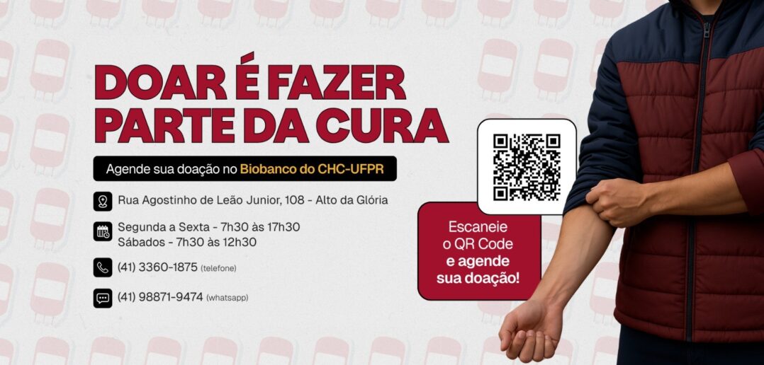 Mobilização – A campanha integra uma ação maior do Complexo Hospital de Clínicas (CHC). Para doar, você deve agendar diretamente no Biobanco do CHC-UFPR, na Rua Agostinho de Leão Junior, 108 – Alto da Glória, em Curitiba.