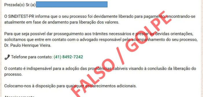O SINDITEST-PR alerta que estão circulando mensagens fraudulentas via WhatsApp utilizando, de forma indevida, o…
