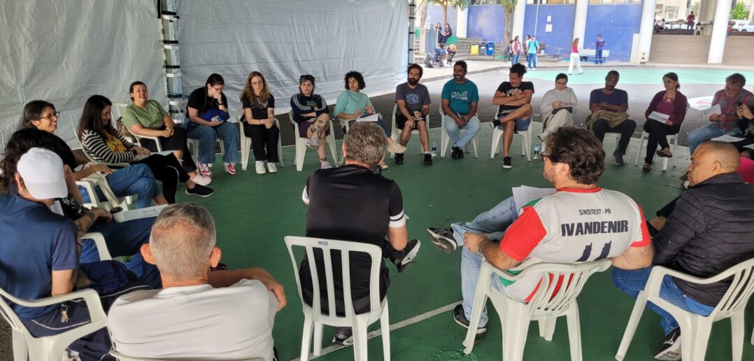 Na manhã desta quarta-feira (04), aconteceu reunião do Comando Estadual de Greve (CEG), com início às 10h, no pátio da Reitoria da Universidade Federal do Paraná (UFPR), sendo instalada às 10h30. Ainda de forma inicial, com questões estruturais e técnicas não adequadas, houve participação ativa dos presentes e remota improvisada com celulares.