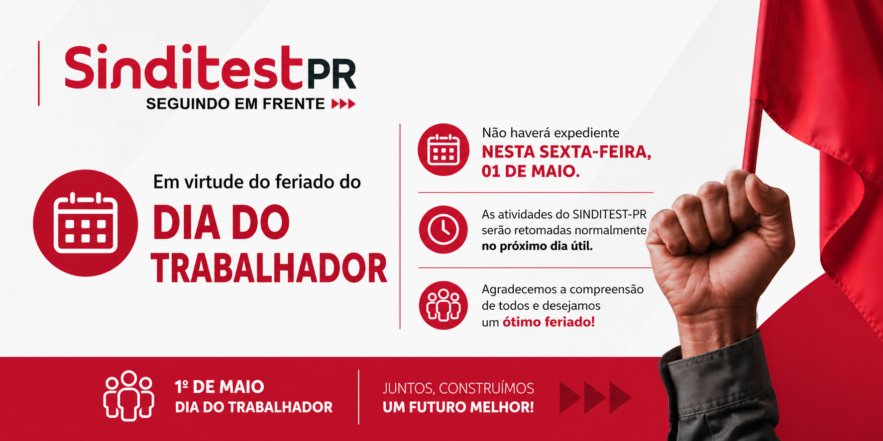 Em virtude do feriado do Dia do Trabalhador, informamos que não haverá expediente nesta sexta-feira, 01 de maio.