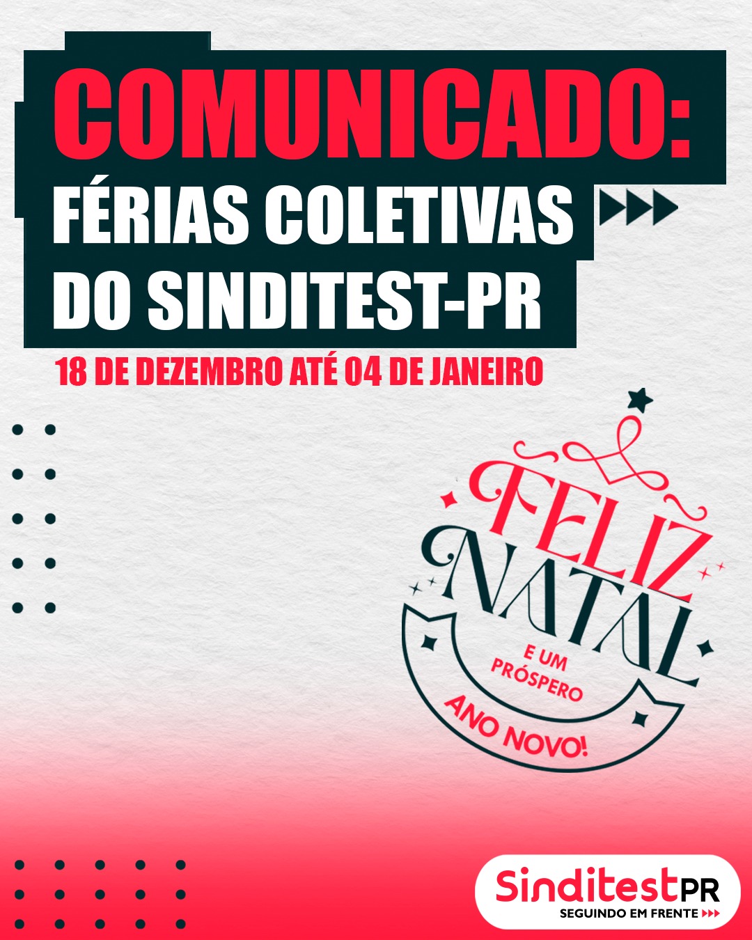 Filiados – aposentados e da ativa, após um 2025 de muitas batalhas em defesa dos nossos direitos, é hora de recarregar as baterias. O Sinditest-PR entrará em férias coletivas para retornar com força total no próximo ano.