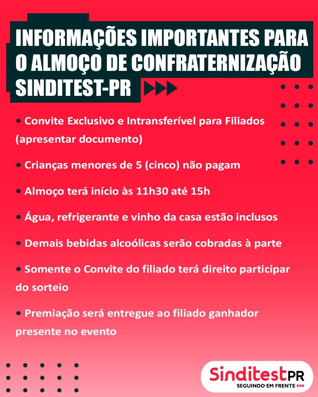 É amanhã! A contagem regressiva para o nosso Almoço de Confraternização do SINDITEST-PR acabou. Estamos preparando tudo com muito carinho para receber vocês!