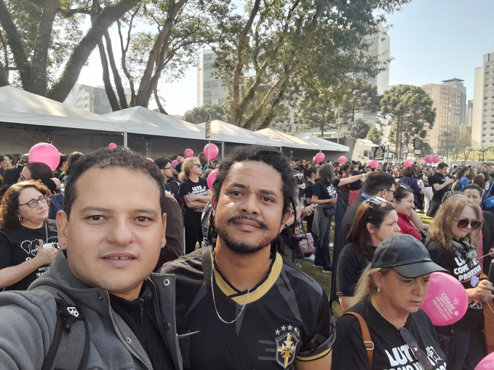 Os coordenadores do Sinditest-PR Diego Medeiros e Marcello Locatelli participaram hoje (17) da greve das professoras e professores da rede municipal de ensino, convocada pelo Sindicato dos Servidores do Magistério Municipal de Curitiba (SISMMAC). O ato ocorreu em frente a Prefeitura de Curitiba