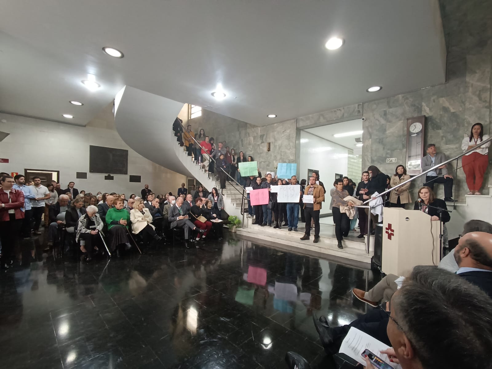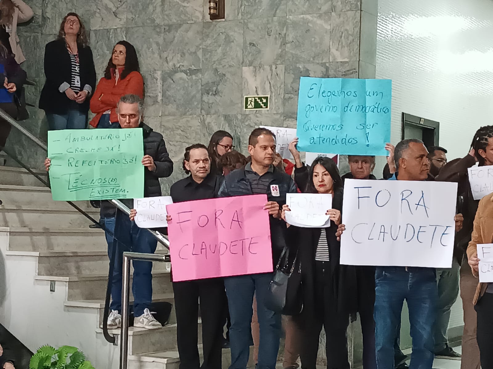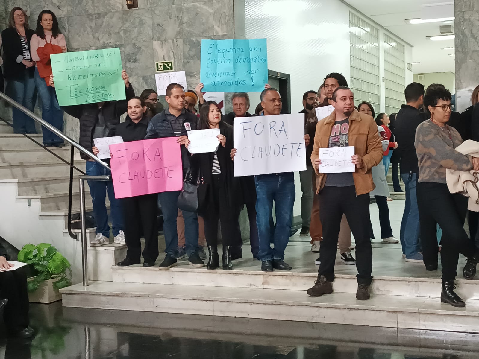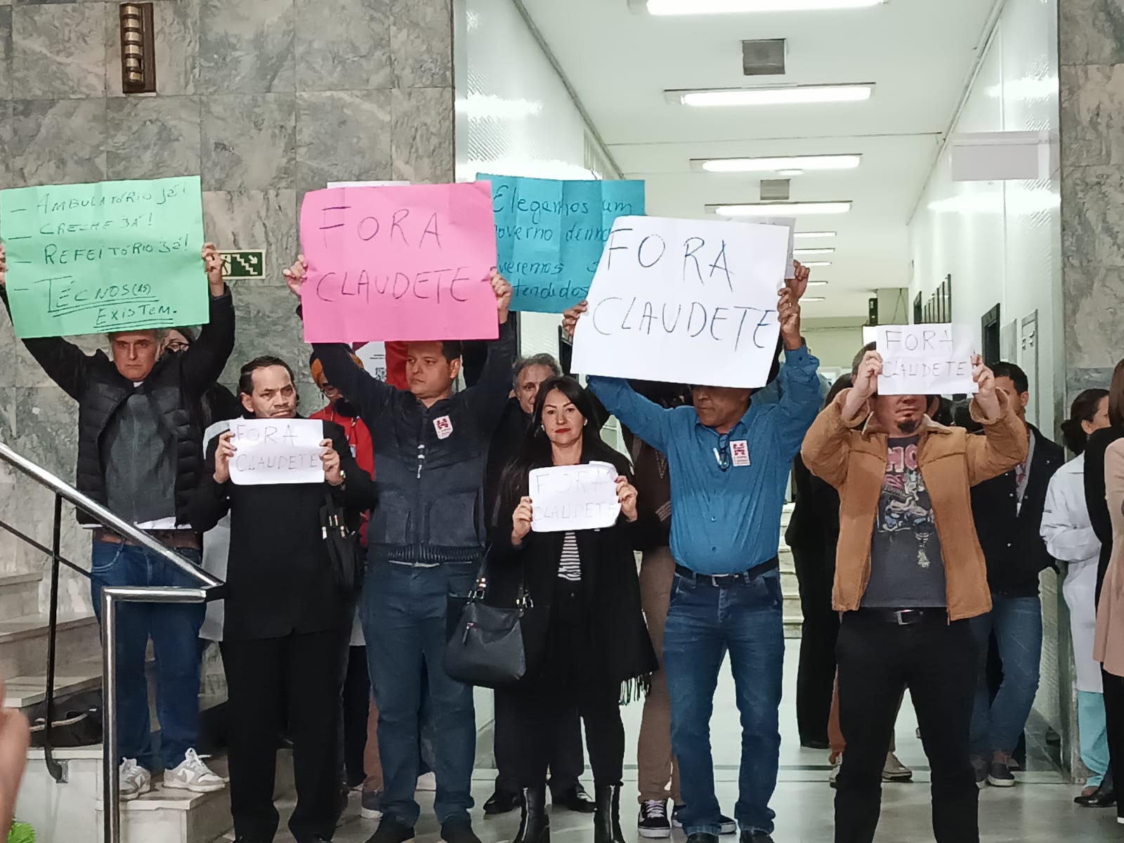 Com cartazes de “Fora Claudete” e a reivindicação de Creche, Ambulatório e Refeitório, a Diretoria eleita do Sinditest-PR, Unidade para avançar, protestou ontem (29) em evento com presidente da EBSERH, no Hall do CHC.