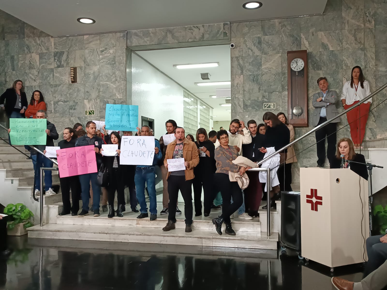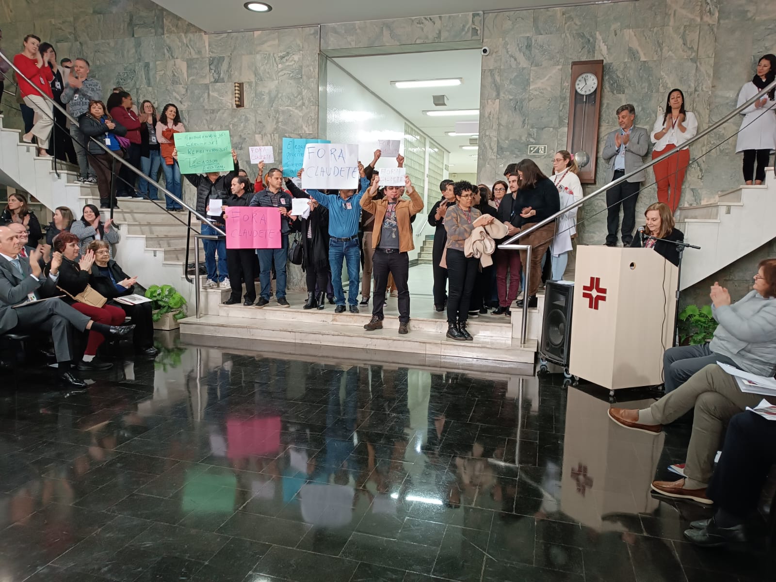Os técnicos e técnicas, já não aguentam mais! A categoria espera que o reitor cumpra as promessas de campanha e exige “Fora Claudete”, para que ela seja substituída por alguém indicado pela comunidade do hospital, através de uma consulta.