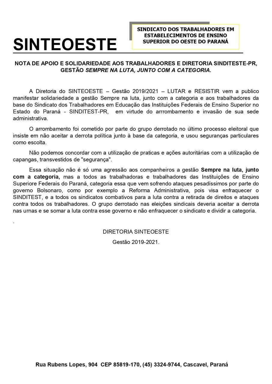 A Diretoria do SINTEOESTE – Gestão 2019/2021 – LUTAR e RESISTIR vem a público manifestar solidariedade a gestão Sempre na luta, junto com a categoria e aos trabalhadores da base do Sindicato dos Trabalhadores em Educação das Instituições Federais de Ensino Superior no Estado do Paraná – Sinditest-PR, em virtude do arrombamento e invasão da sua sede administrativa.