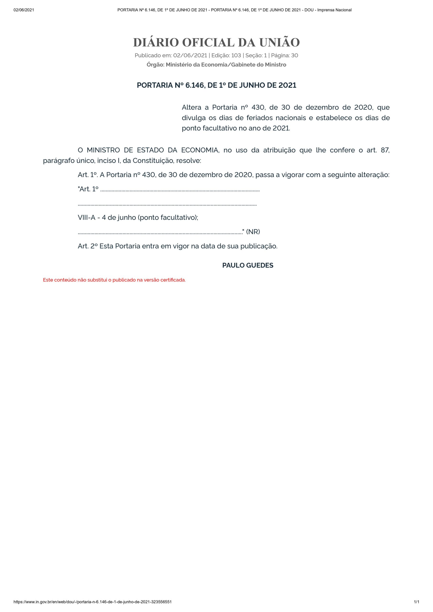 Segundo Portaria nº 6.146, publicada em 1º de Junho de 2021, o dia 4 de junho desse mês será considerado ponto facultativo.