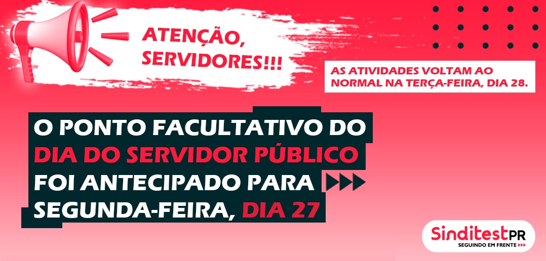 O SINDITEST-PR comunica a antecipação do ponto facultativo em comemoração ao Dia do Servidor Público (tradicionalmente celebrado em 28 de outubro) para a segunda-feira, dia 27. Ressaltamos que nosso expediente retornará à normalidade na terça-feira, dia 28.