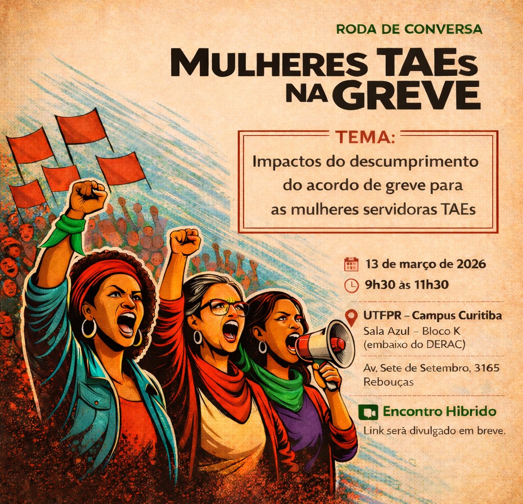 Nesta sexta-feira (13/03), das 9h30 às 11h30, acontece na Universidade Tecnológica Federal do Paraná (UTFPR) uma roda de conversa com o tema “Impactos do descumprimento do acordo de greve para as mulheres servidoras TAEs”. A atividade reunirá trabalhadoras técnico-administrativas em educação para analisar coletivamente os efeitos das medidas recentes sobre a carreira e sobre as condições de trabalho das mulheres. O encontro pretende abrir um espaço de debate, escuta e construção coletiva sobre como o não cumprimento de pontos do acordo de greve atinge de forma desigual as mulheres da categoria.