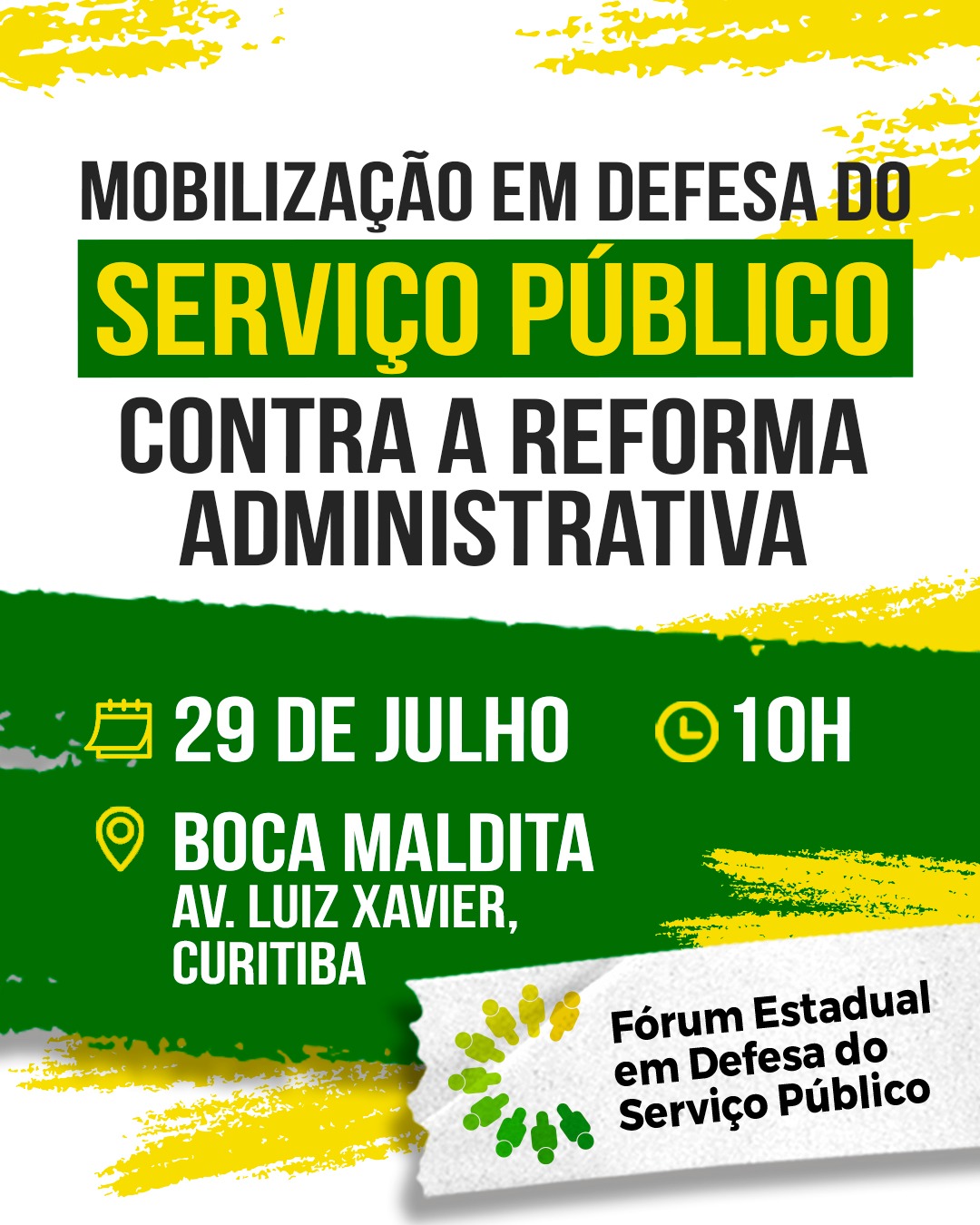 O Fórum Estadual em Defesa do Serviço Público irá realizar uma ação de conscientização e mobilização contra o avanço das propostas de Reforma Administrativa em discussão na Câmara dos Deputados. A atividade unificada, que contará com a participação de sindicatos acontecerá na Boca Maldita, na Avenida Luiz Xavier (Calçadão da Rua XV), no Centro de Curitiba, no próximo dia 29 de julho, das 10 às 14 horas.
