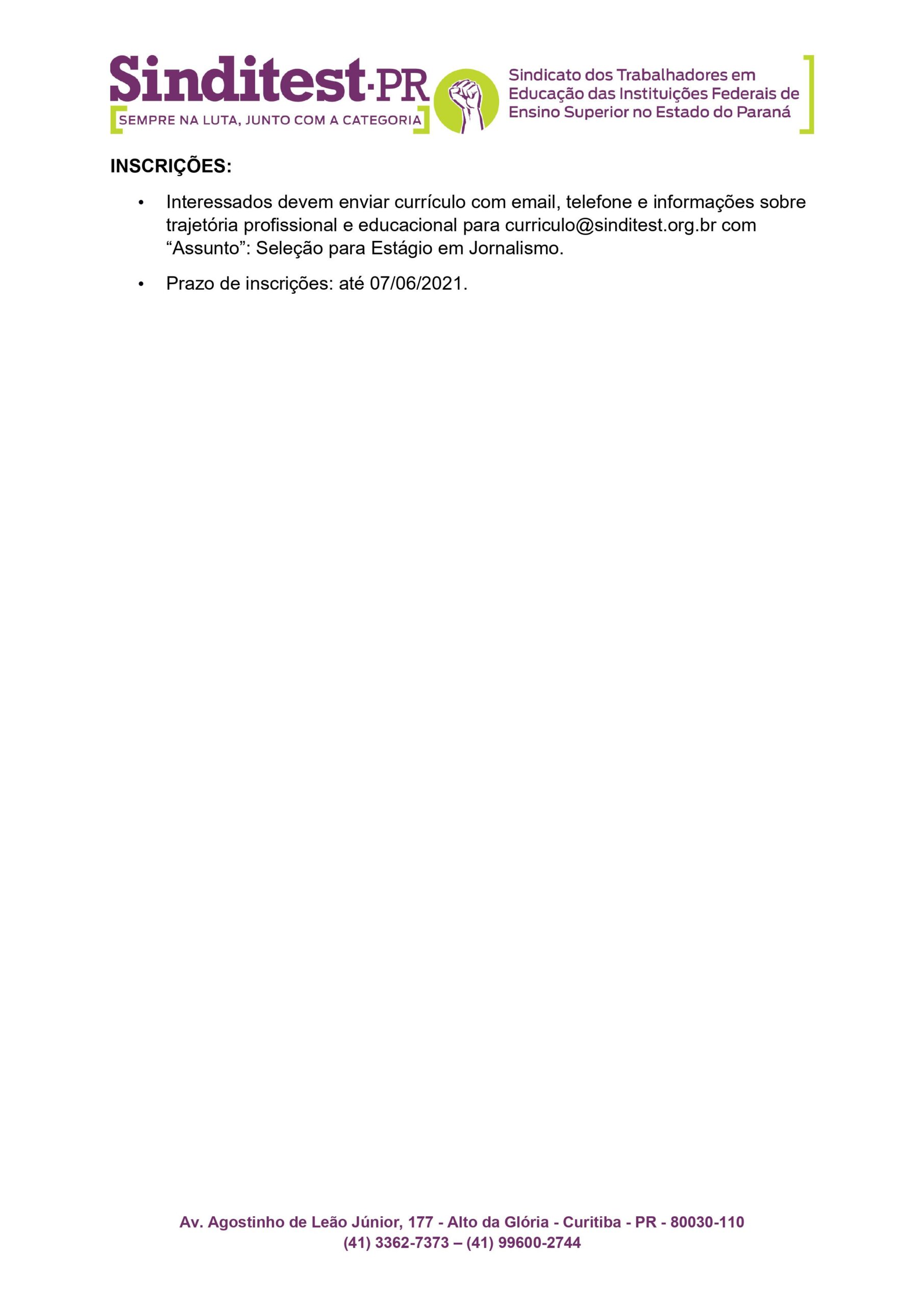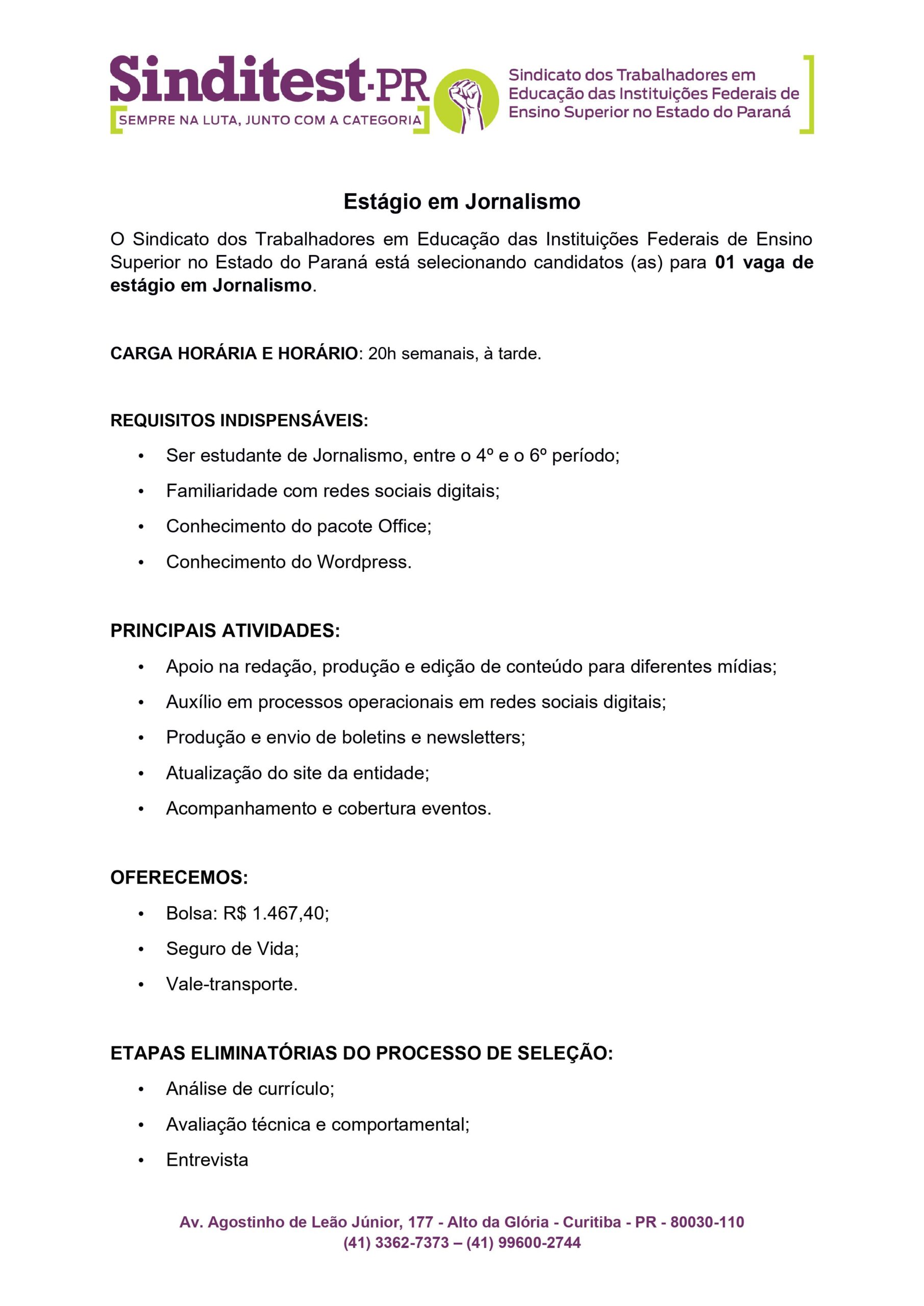 O Sinditest-PR está selecionando candidatos e candidatas para uma vaga de Estágio em Comunicação. Entre os requisitos para o cargo estão ser estudante de jornalismo e estar cursando entre o 4º e o 6º período do curso. Será considerado um diferencial familiaridade com redes sociais digitais, conhecimento do pacote Office e de wordpress. Os interessados(as) devem enviar currículo com e-mail, telefone e informações sobre trajetória profissional e educacional para [email protected]. O campo “assunto” deverá ser preenchido com “Seleção para Estágio em Jornalismo”. O prazo de inscrições vai até 7 de junho. Clique aqui e confira o edital completo.
