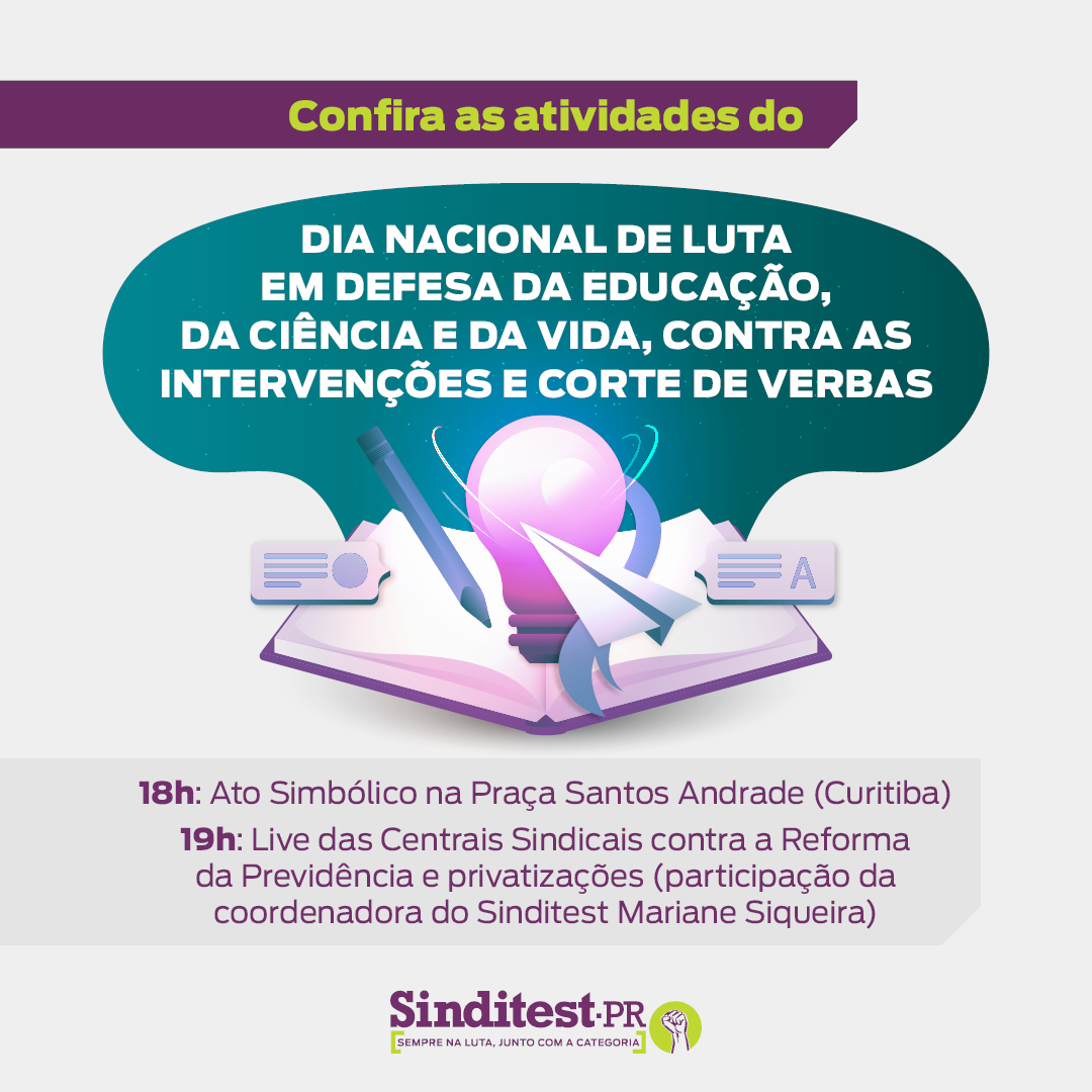 Em Curitiba, o Dia de Luta de amanhã (13) tem como ponto alto um Ato Simbólico na Praça Santos Andrade, às 18h. Além disso, uma live organizada pelas Centrais Sindicais será transmitida às 19h pelos Sindicatos nas redes sociais digitais. Mariane Siqueira, coordenadora do Sinditest, representará a entidade no evento, que tem como pauta a discussão sobre a Reforma Administrativa (PEC 32), bem como as privatizações em geral.
