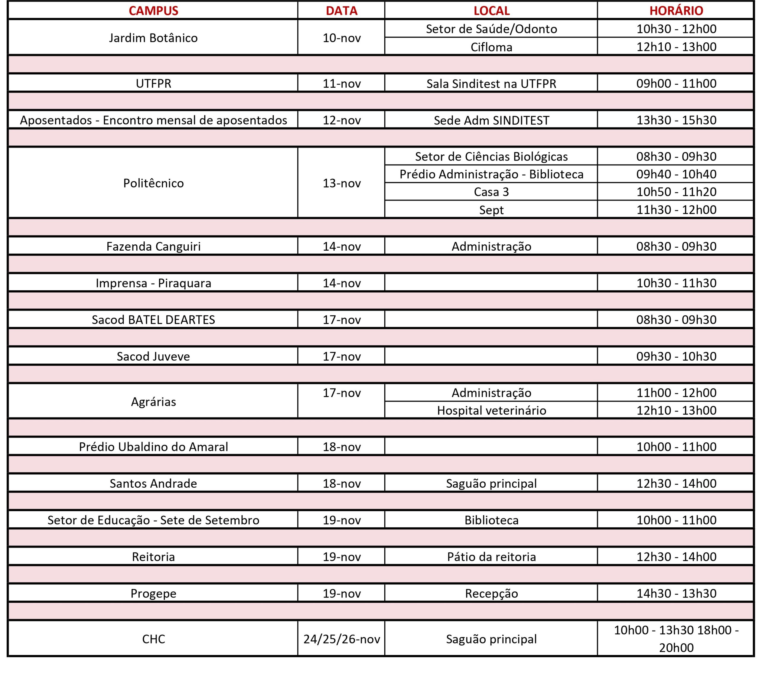 A participação no almoço é pessoal e intransferível e está condicionada à retirada do convite na Sede Administrativa. Haverá entrega também nas unidades da UFPR, confira na tabela abaixo os dias e horários.