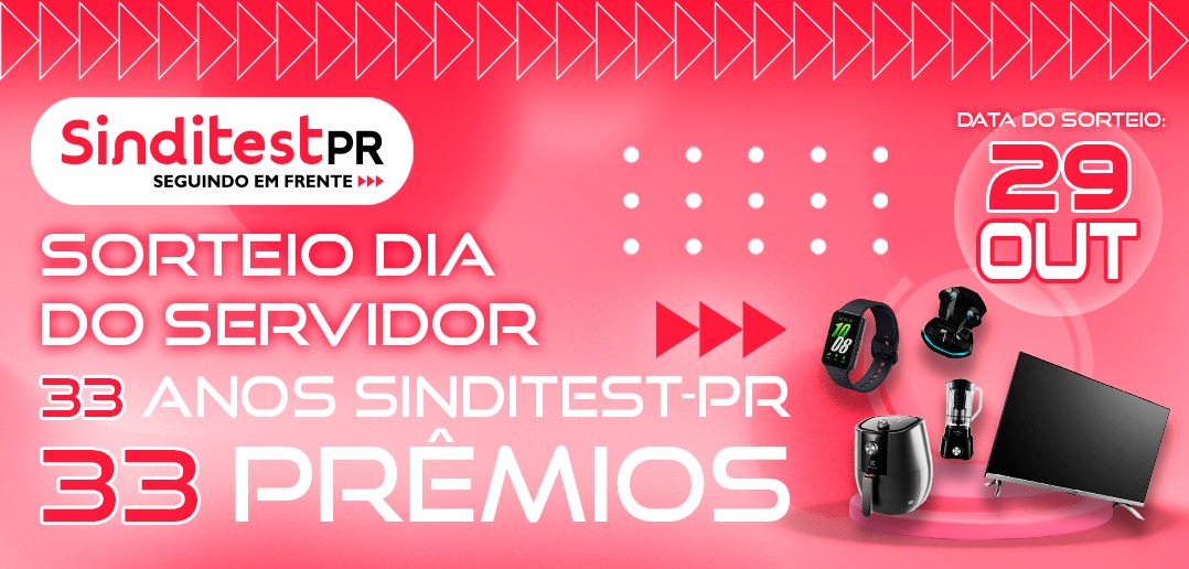 Em celebração ao Dia do Servidor Público, comemorado em 28 de outubro, e aos seus 33 anos de fundação, o SINDITEST-PR irá sortear um total de 33 prêmios para seus servidores e servidoras filiados. A promoção, batizada de “33 Anos, 33 Prêmios”, visa prestigiar a categoria e integra uma série de atividades definidas pela diretoria.